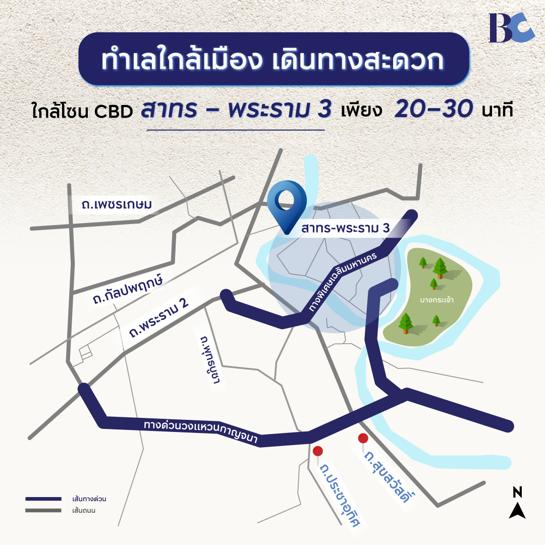 ใกล้เมือง ราคาที่เข้าถึงได้: เดินทางสู่โซน CBD สาทร – พระราม 3 ได้ง่าย รวดเร็ว (ประมาณ 20-30 นาที)