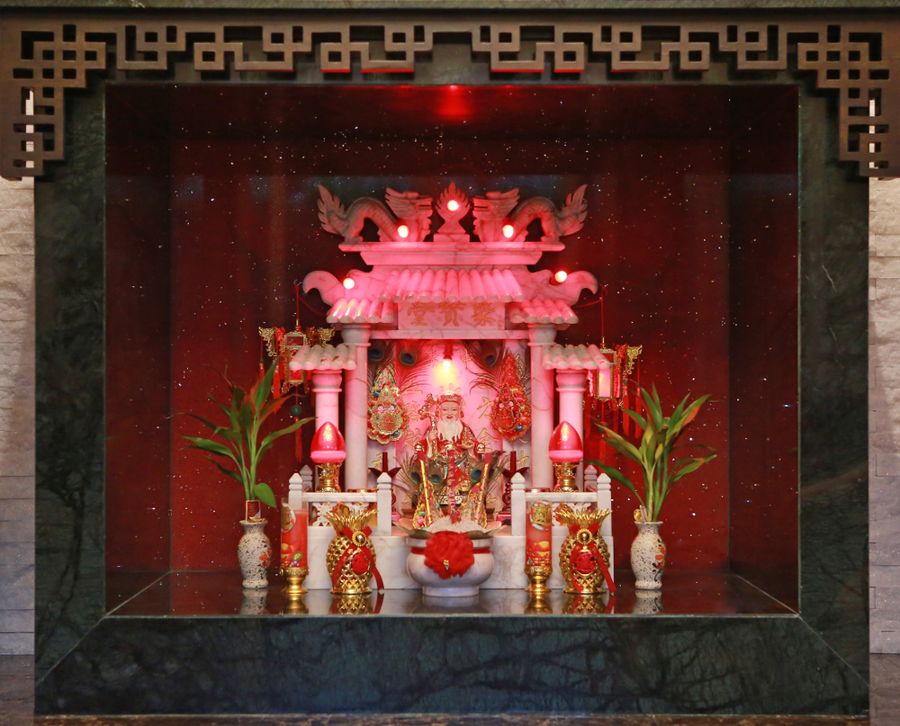1. เทวรูป/แท่นบูชา วางเทวรูปไว้บนโต๊ะด้านหลังสุด ถ้าเป็นแท่นบูชาให้ใช้โต๊ะจัดของไหว้ที่เตี้ยกว่าแท่นบูชา