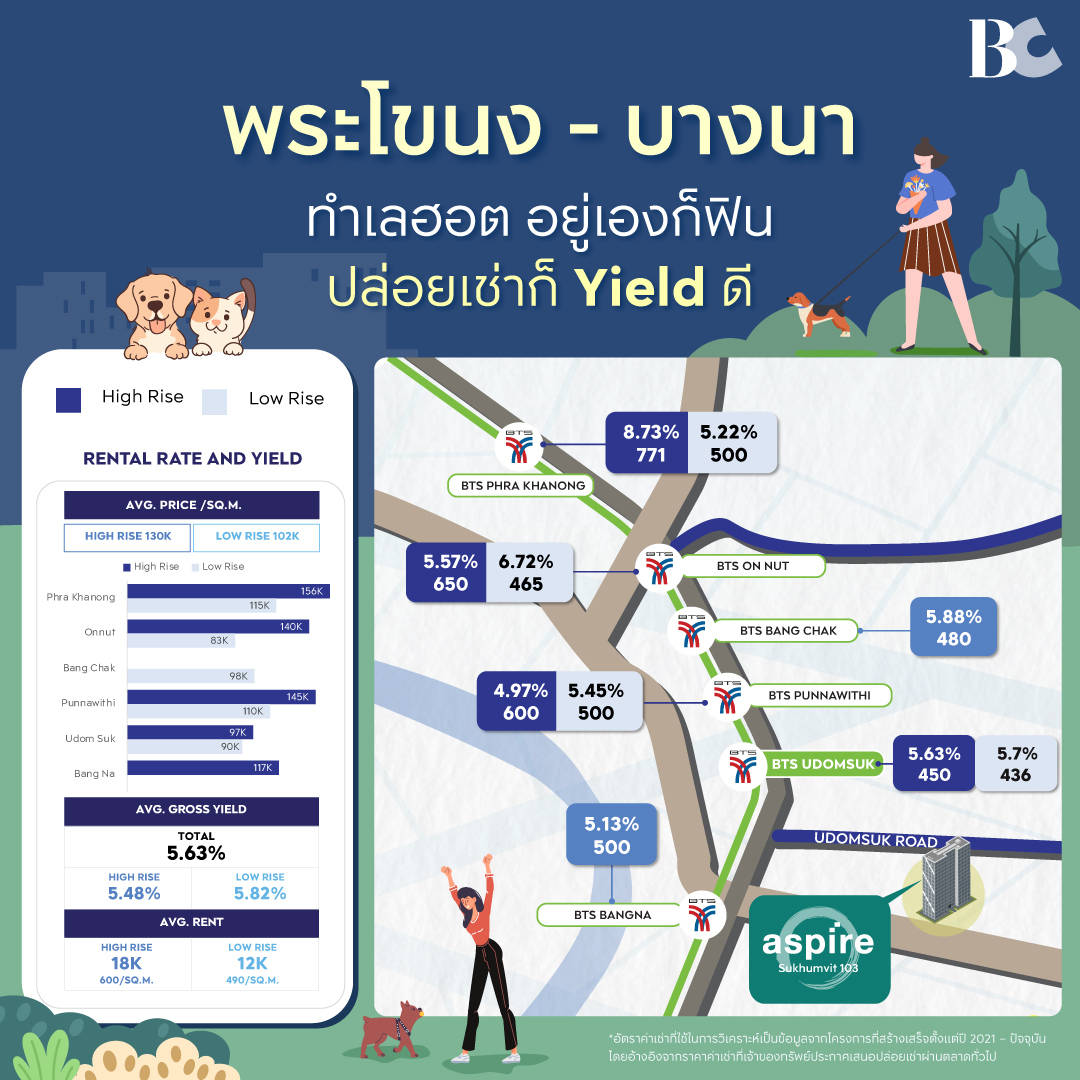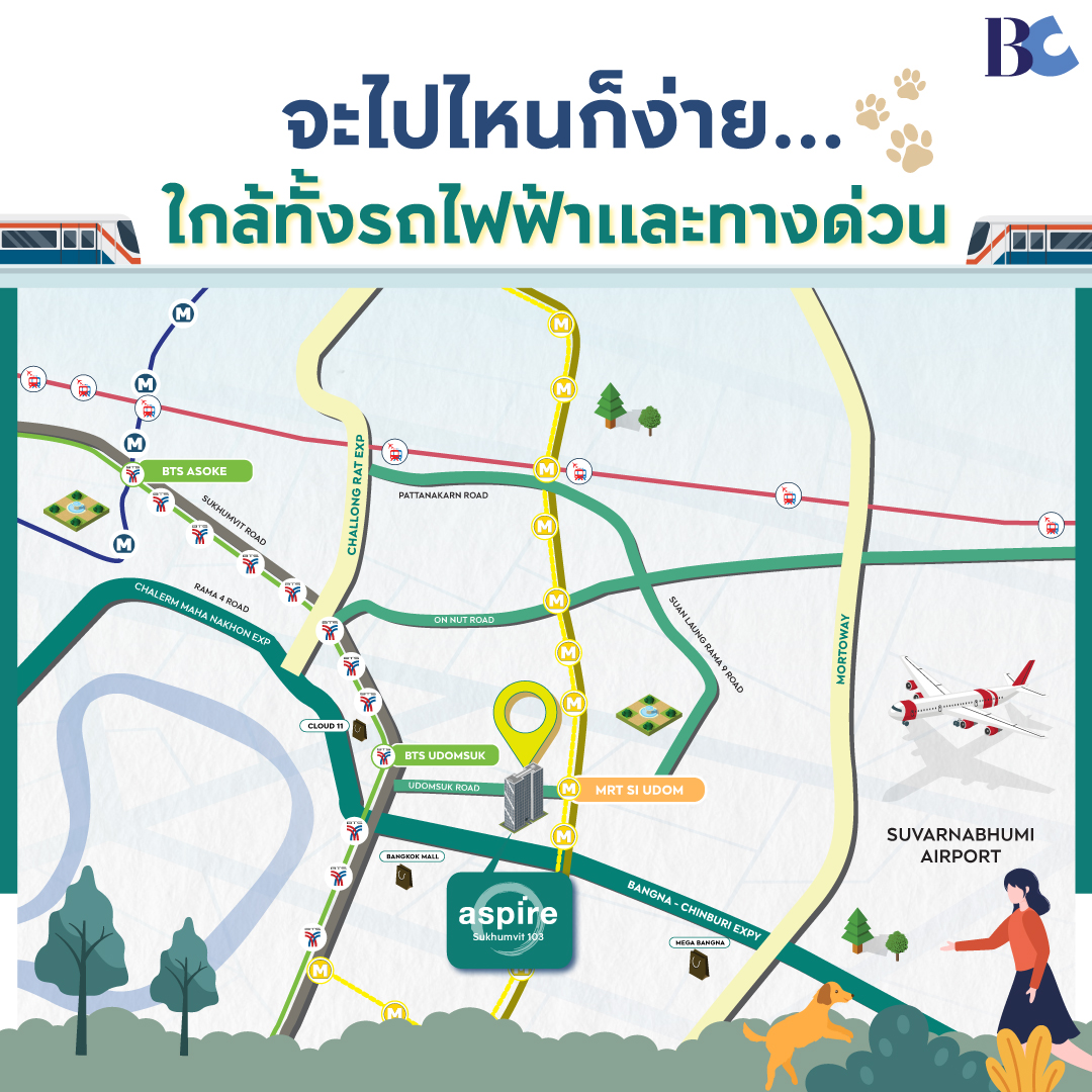 โครงการมีห้องหลายประเภท ตั้งแต่ 1 ห้องนอน 27–38 ตร.ม. และ 2 ห้องนอน 45 ตร.ม. 1 ห้องนอน S ขนาด 27 ตร.ม. ราคาเริ่มต้นประมาณ 2.5 ล้านบาท 1 ห้องนอน ขนาด 30.5 ตร.ม. ราคาเริ่มต้นประมาณ 2.8 ล้านบาท 1 ห้องนอน + ขนาด 35 ตร.ม. ราคาเริ่มต้นประมาณ 3.3 ล้านบาท 1 ห้องนอน + (Corner) ขนาด 38 ตร.ม. ราคาเริ่มต้นประมาณ 3.6 ล้านบาท 2 ห้องนอน ขนาด 45 ตร.ม. ราคาเริ่มต้นประมาณ 4.4 ล้านบาท ราคาเฉลี่ยต่อตร.ม.อยู่ระหว่าง 92,000–97,000 บาท ถือว่าเหมาะสมกับกลุ่มตลาด economy – middle class โครงการตั้งอยู่ใกล้ BTS อุดมสุขเพียง 3 นาที และ MRT ศรีอุดม 5 นาที อีกทั้งยังมี LRT สายใหม่เชื่อมสนามบินและ CBD การเดินทางโดยรถยนต์สะดวก ใกล้ ทางด่วนเฉลิมมหานคร และ ทางด่วนบูรพาวิถี เพียง 8–10 นาที ทำเลนี้ยังใกล้โครงการใหม่อย่าง Bangkok Mall และ Cloud 11 ทำให้โซนอุดมสุขกลายเป็นย่านที่กำลังเติบโต มีความคึกคัก และมีมูลค่าเพิ่มสูง ห้องน้ำใช้ผลิตภัณฑ์คุณภาพ Cotto พื้นห้องเป็น SPC แข็งแรง ทนทาน อาคารบางตึกสามารถ เลี้ยงสัตว์ได้ พร้อมฟังก์ชันเฉพาะสำหรับสัตว์เลี้ยง พื้นที่ส่วนกลางออกแบบ Urban Odyssey Yard ให้ผู้อยู่อาศัยและสัตว์เลี้ยงได้ใช้พื้นที่สีเขียว ราคาเริ่มต้น 2.59 ล้านบาท ในทำเลอุดมสุข ถือว่าคุ้มค่า เหมาะทั้งผู้ที่อยู่อาศัยเองและนักลงทุน โครงการนี้ตอบโจทย์ตลาดกลุ่ม economy – middle class และมีศักยภาพการเติบโตสูง โครงการให้ความสำคัญกับพื้นที่สีเขียว มี สวนสำหรับพักผ่อน และพื้นที่ สำหรับสัตว์เลี้ยง พร้อมสภาพแวดล้อมที่ปลอดภัยและออกแบบอย่างมีฟังก์ชัน ASPIRE SUKHUMVIT 103 เป็นคอนโด Low-Rise ใหม่ล่าสุดในอุดมสุขที่ โดดเด่นทั้งทำเล การเดินทาง วัสดุและการออกแบบ โครงการนี้เหมาะทั้งผู้ที่อยู่อาศัยเองและนักลงทุน ด้วยราคาเริ่มต้นเพียง 2.59 ล้านบาท ทำเลใกล้ BTS อุดมสุข, MRT ศรีอุดม, ทางด่วน และโครงการใหม่ในพื้นที่รอบ ๆ ด้วยสิ่งอำนวยความสะดวกครบครัน ทั้ง ห้างสรรพสินค้า, ตลาด, โรงเรียน, โรงพยาบาล และสำนักงาน พร้อมพื้นที่สีเขียวและฟังก์ชันสำหรับสัตว์เลี้ยง ทำให้ Aspire Sukhumvit 103 เป็น หนึ่งในโครงการที่คุ้มค่าและน่าจับตามองที่สุดในย่านอุดมสุข หากคุณกำลังมองหาคอนโดเพื่ออยู่อาศัยเอง หรือเพื่อการลงทุนในทำเลทองของกรุงเทพฯ Aspire Sukhumvit 103 ถือเป็นตัวเลือกที่ไม่ควรมองข้ามประเภทห้องและราคา